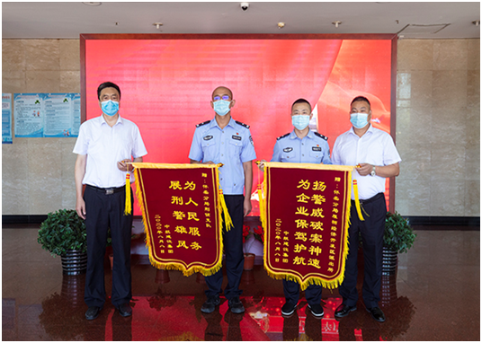 培训中心主任孔德明代表华体会手机网页版登录入口-华体会(中国) 向怀柔分局雁栖经济开发区派出所所长和怀柔分局刑侦支队支队长送上锦旗,代表公司感谢人民警察服务企业生产建设、守护一方平安付出的艰辛努力,感谢怀柔分局雁栖开发区派出所和怀柔分局刑侦支队急企业所急、想人民所想,在企业遇到困难时及时出警,有力保障了企业财产安全,维护了社会良好秩序,为企业发展创造了平安和谐的营商环境。